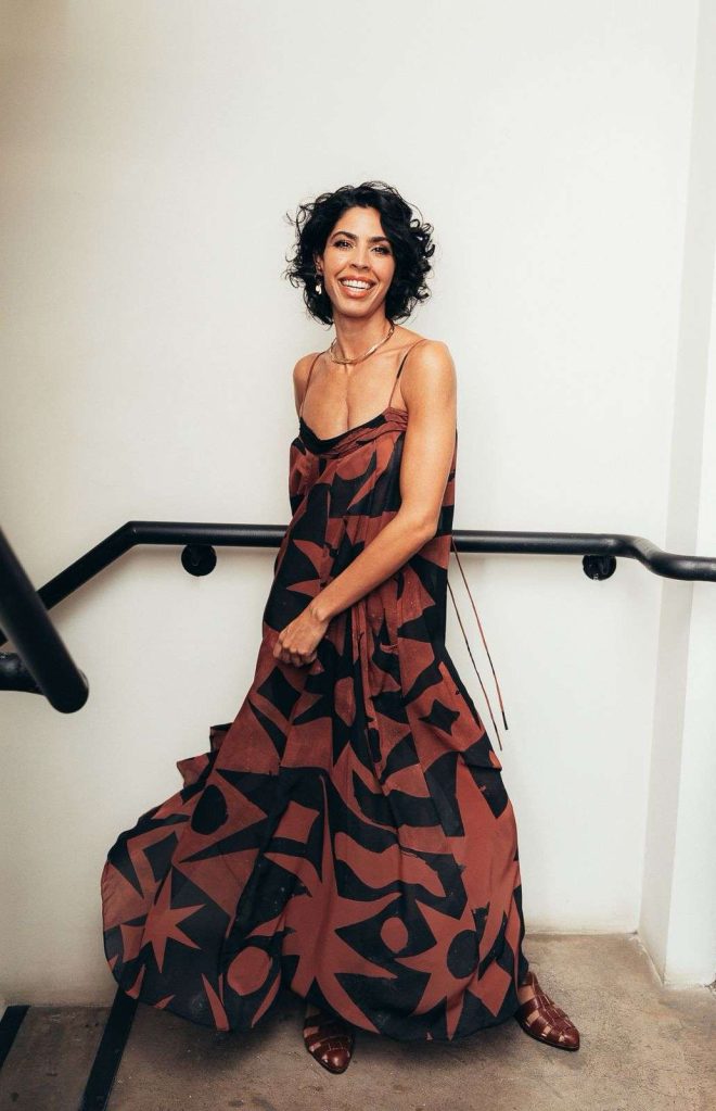 Vestido de alça regulável com ajuste nas costas, bolsos frontais, saia ampla, feito em nossa estampa exclusiva, símbolos de avivamento.